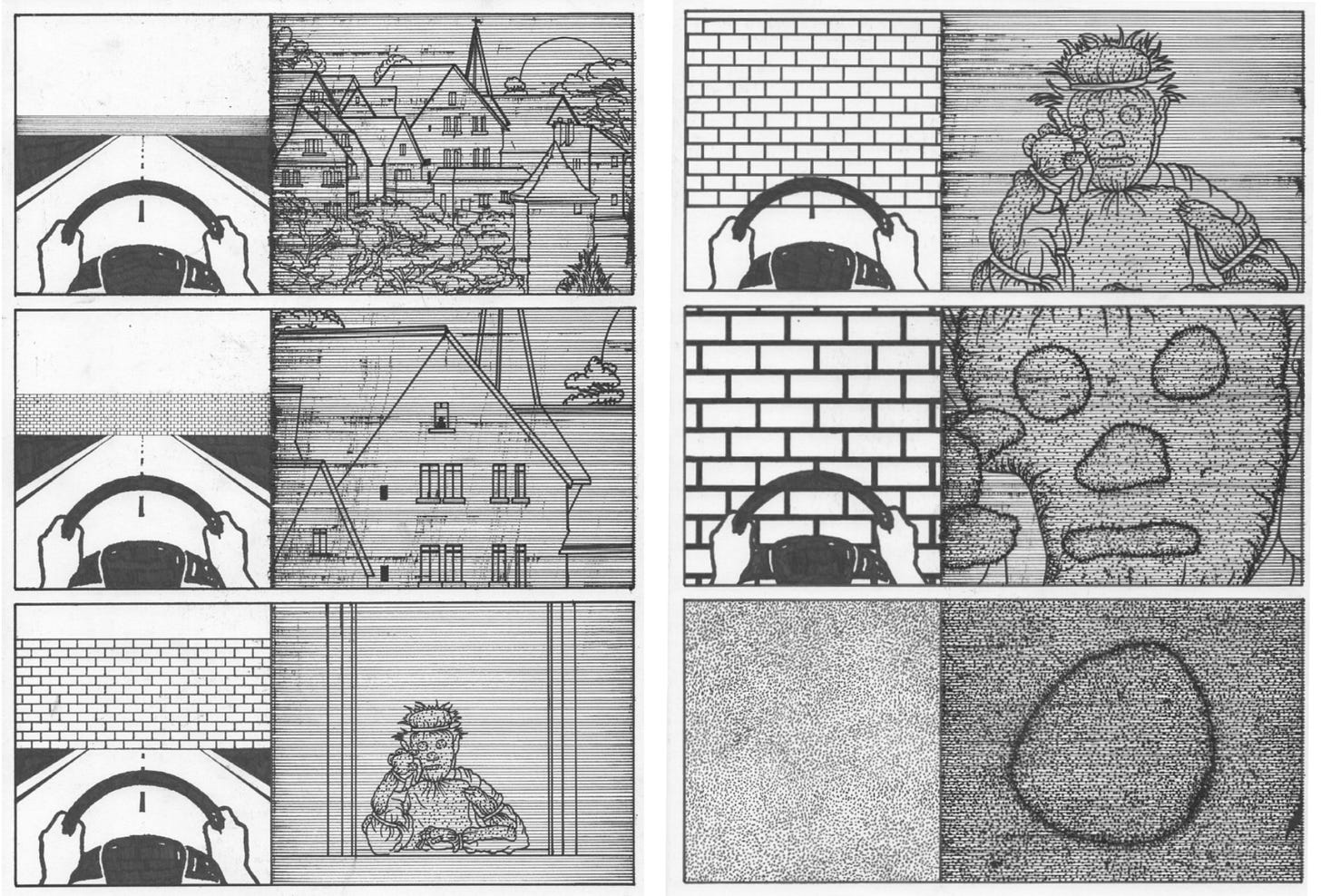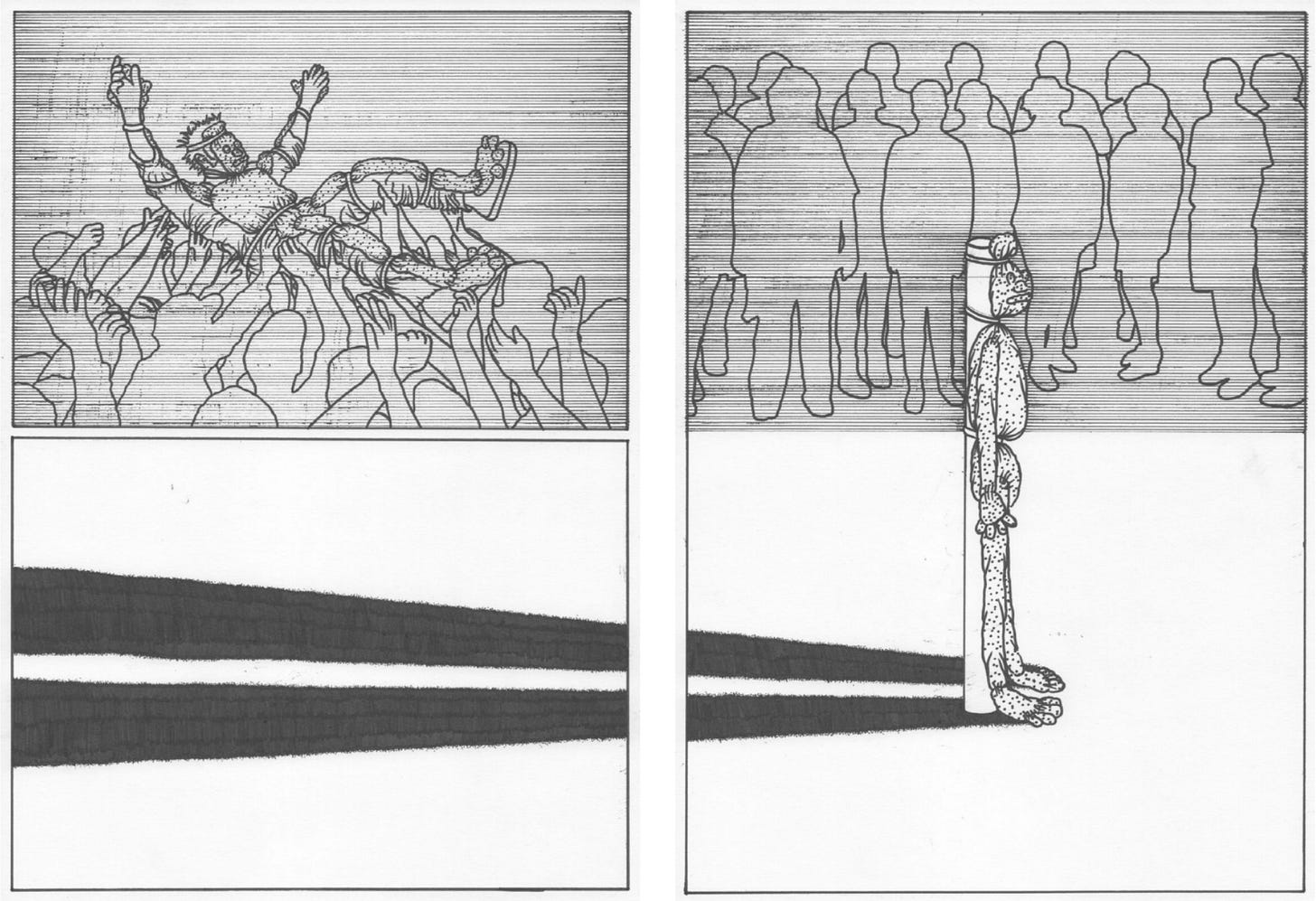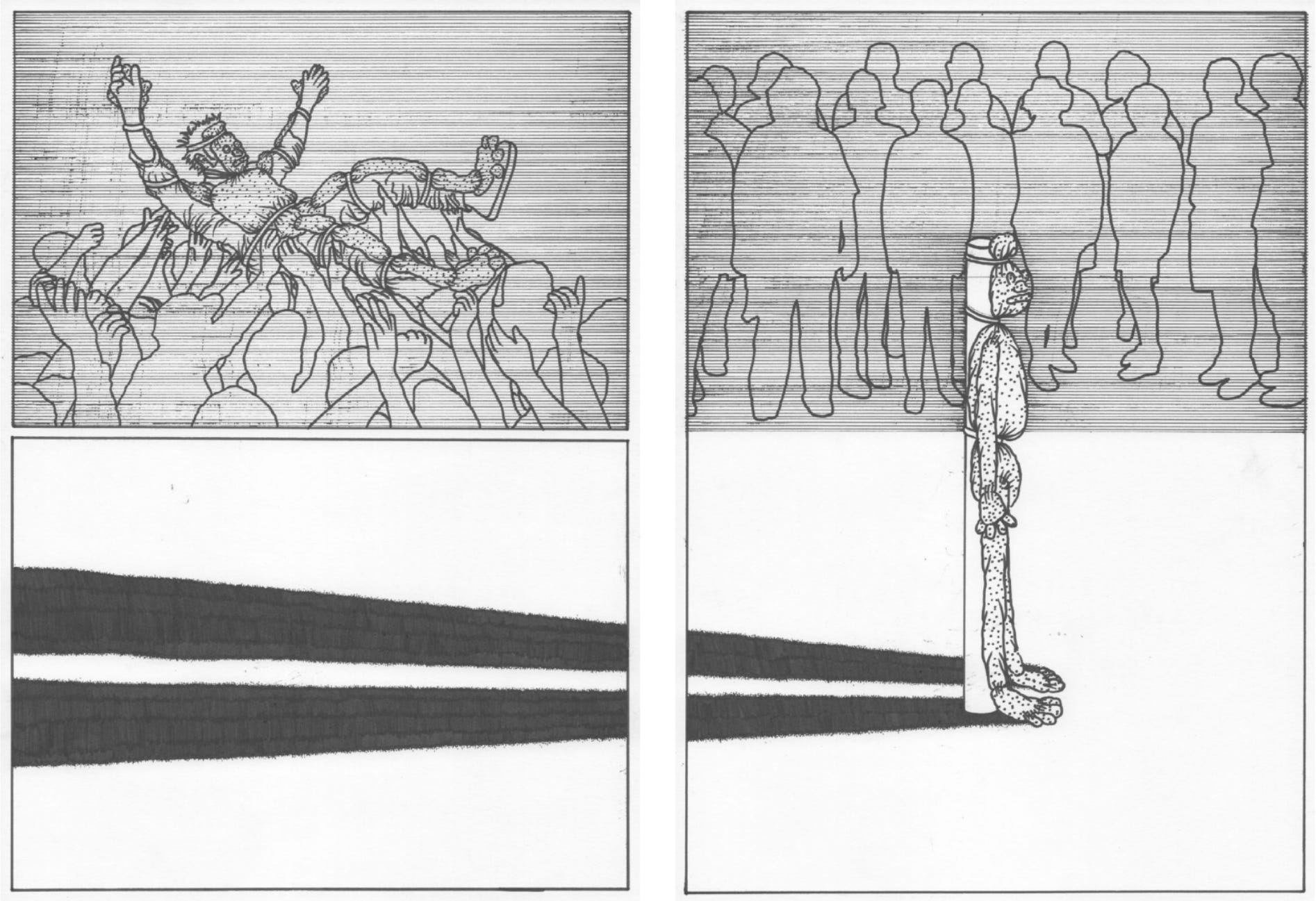 Jefford is making art that can survive in the blackout. Is not the style of his drawings, their sparse line work, conducive to being sent across pirate radio channels at a low bit rate? These are images to be faxed to evade the internet. The narratives themselves are paranoiac; we sense the eerie proximity of a spy or priest lurking offstage, plotting to denounce. In one example, we witness the pandemonium of a mob rousing a scarecrow character. It is disguised in apocalyptic sackcloth or animal fur, like a saint in a hair shirt infested with lice. Swiftly it is carried aloft, exalted as a messiah or dragged to a lynching. Abruptly, the source of the long shadow in the panels below is made evident. Our hero is tied to a stake. The mob, now placid, is waiting, presumably for a volley of ammunition. Noticing the tattered body armour, we have the sense this has happened countless times before. The character is a scapegoat, put through an eternal cycle of punishment.