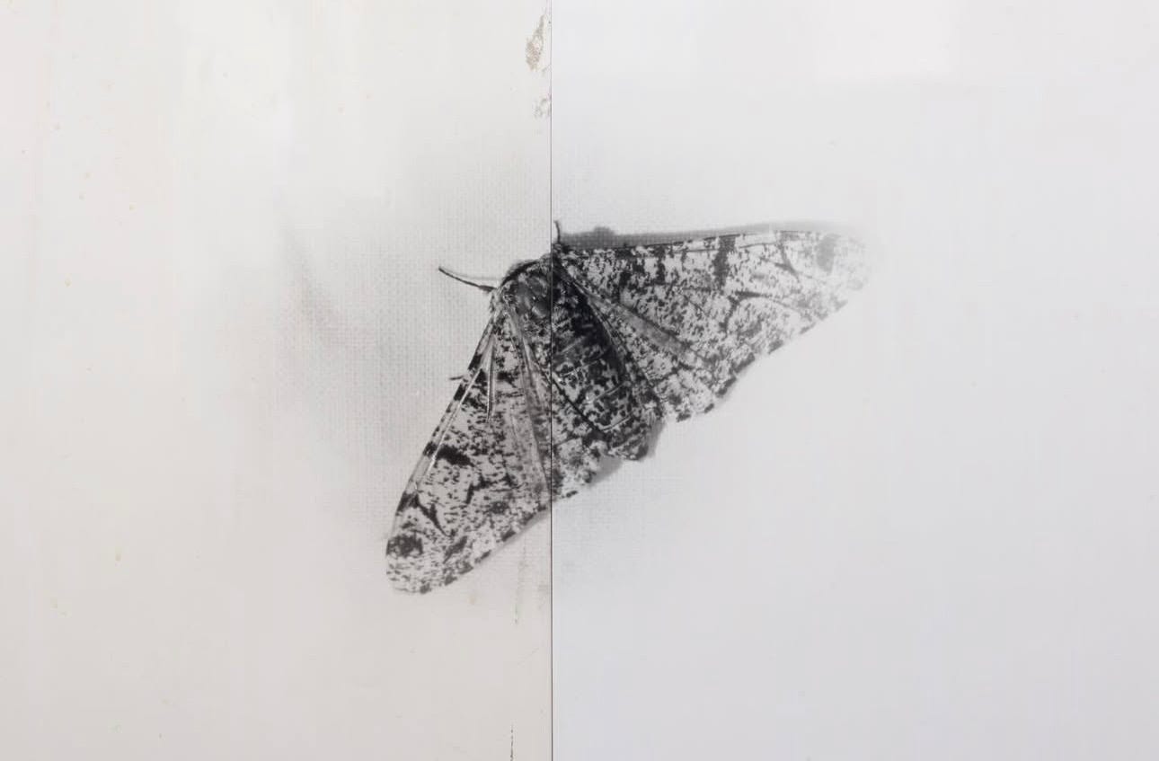 Untitled (Biston betularia), 2026, Silver gelatin print on plywood panel, aluminium tape, white paint, 160 × 200 cm